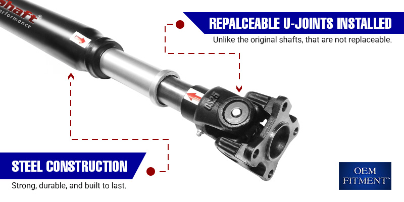 Benefits: Durashaft.OEM Fitment product. Replaceable U-Joints installed.